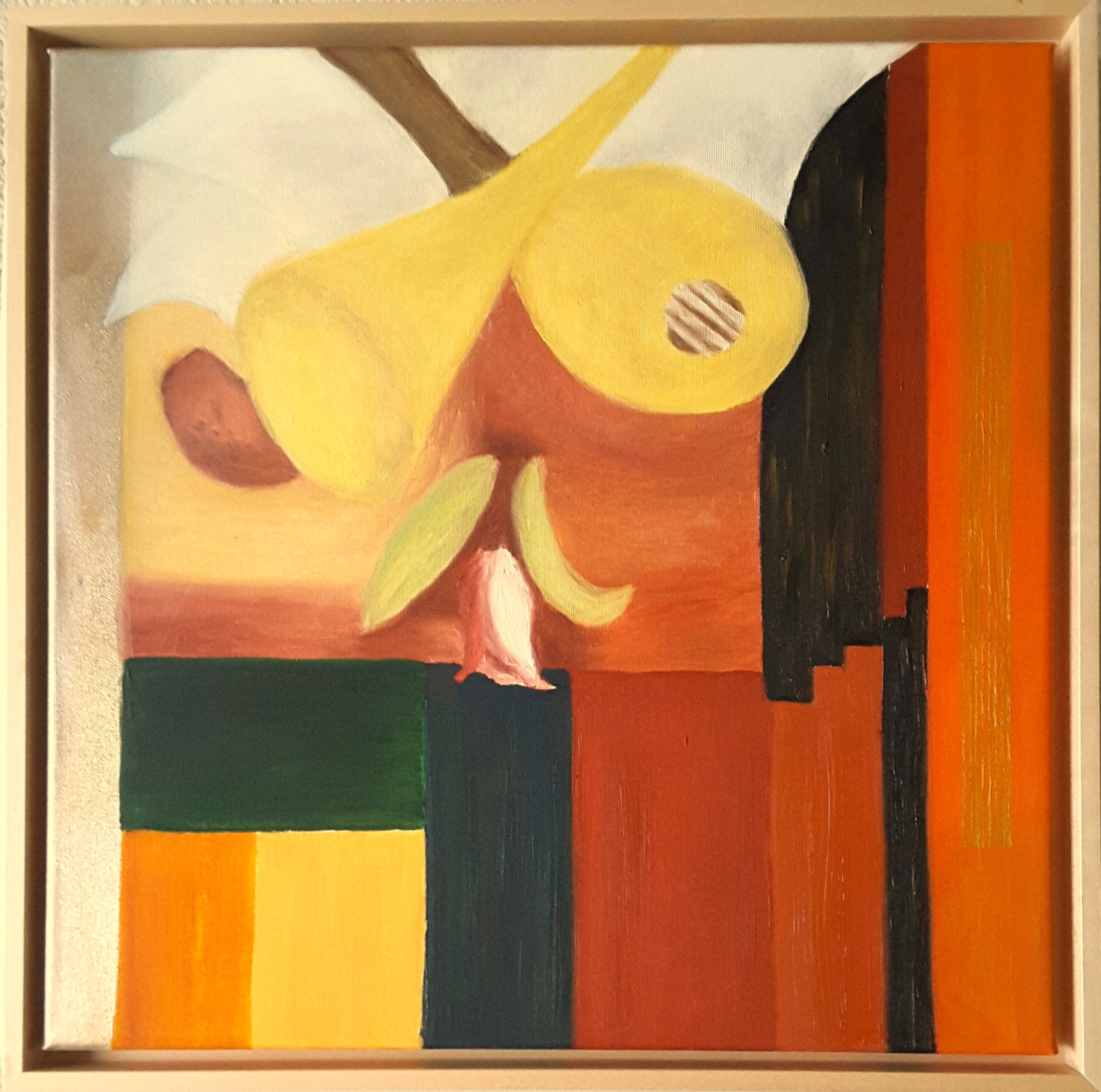 Kräftige Farbblöcke und geschwungene Linien, geometrische und vereinfachte Formen mit dominierenden warmen Gelb-, Orange-, Braun- und Grüntönen, ergänzt durch Blautöne und Schwarz, was einen starken Farbkontrast erzeugt.