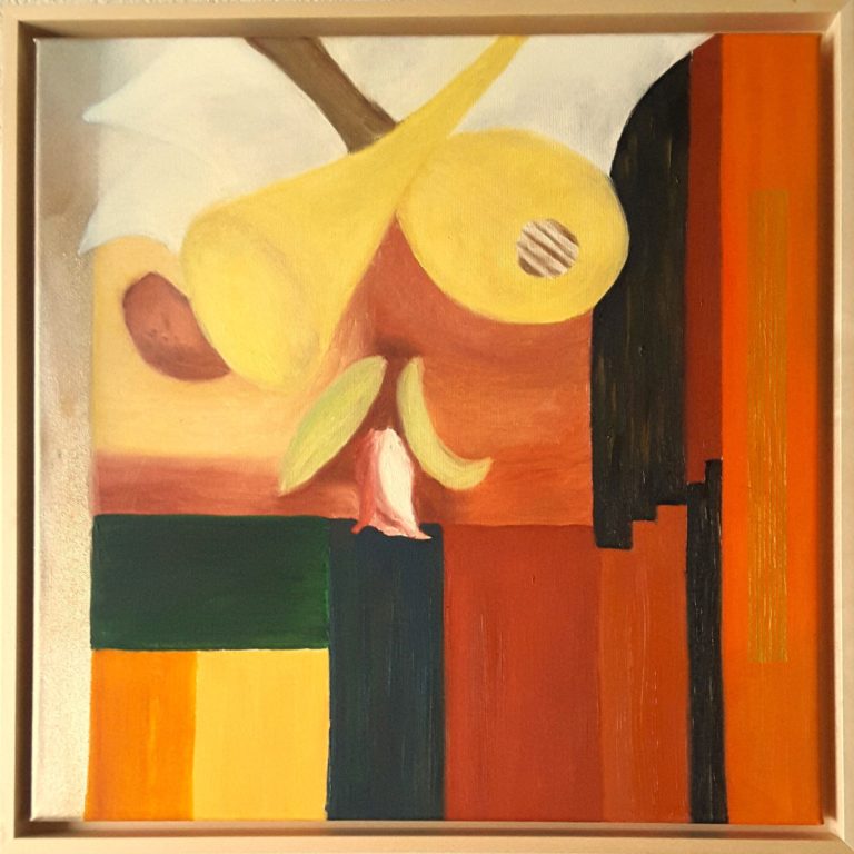 in einem Stil, der an den Kubismus oder die Bauhaus-Ära erinnert und stillierte Objekte - ein Horn und ein Musikinstrument - darstellt.